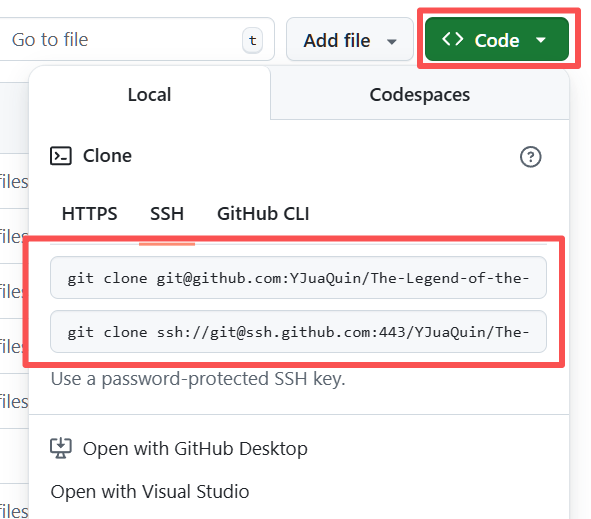 如果构建仓库勾选了README / .gitignore / License ,这时仓库已经初始化并包含一次提交,接下来进入仓库,点击 Code ,复制其中一个链接