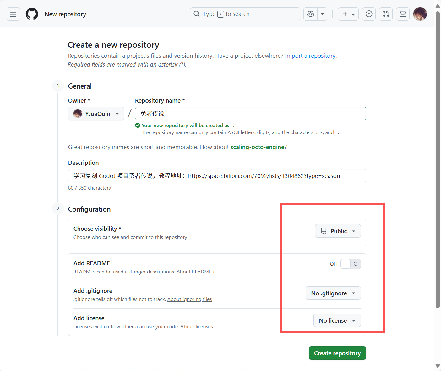 第一个是设置仓库可见性,Public 是公有仓库,所有人都能看见,Private 是私有仓库,只有你能看见
