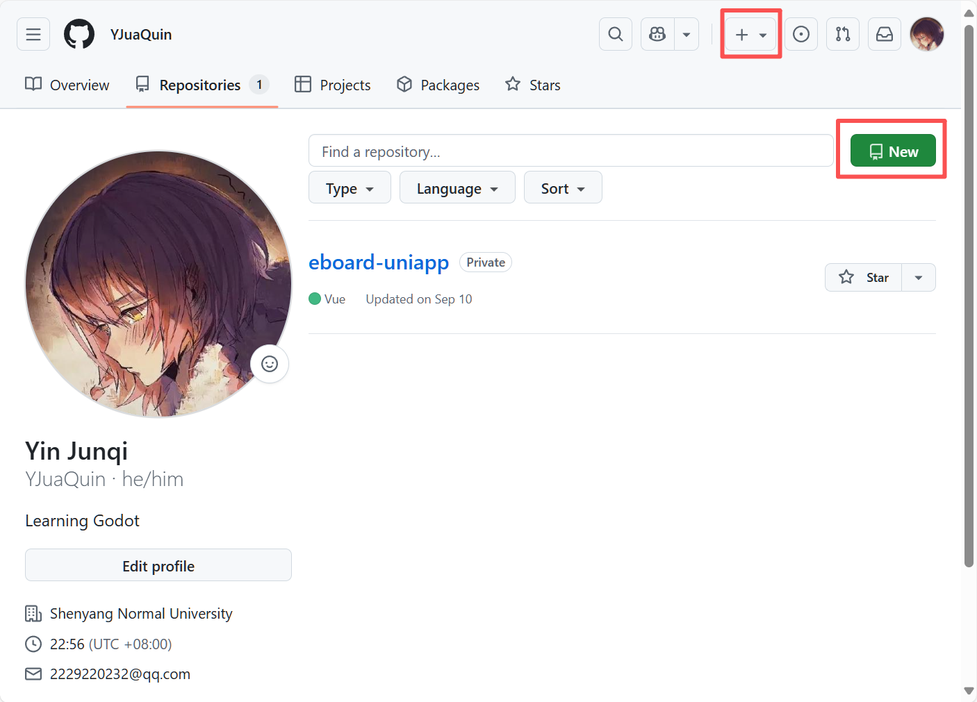 进入 GitHub 官网,如图,点击 New 或者加号内的 New Repository